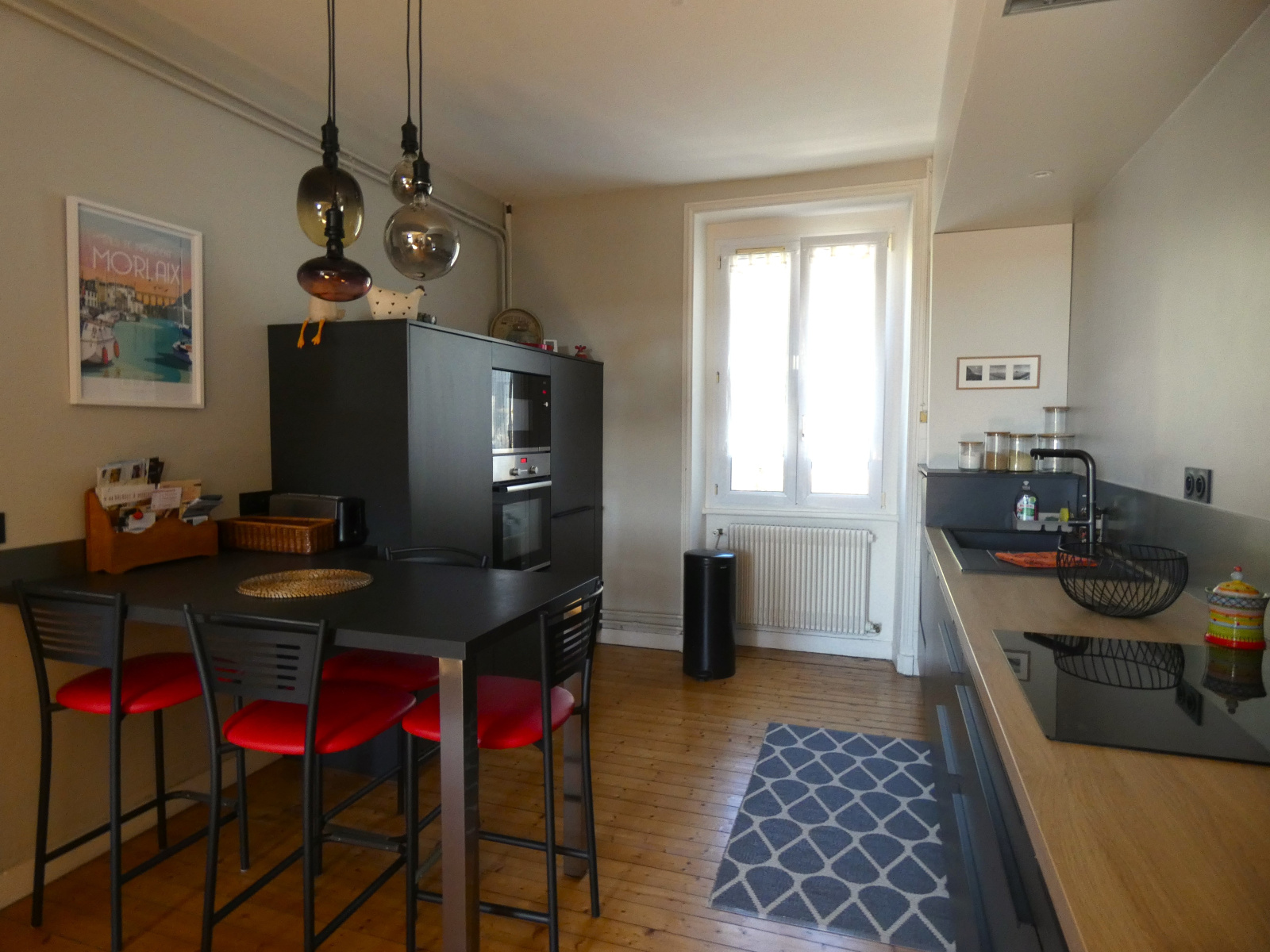 Finistère, à vendre à Morlaix, appartement idéalement situé, dans le quartier des Ursulines. Au deuxième et dernier étage d'un petit immeuble de caractère, découvrez cet appartement sur parquets entièrement rénové. Il se compose d'une entrée, une cuisine aménagée et équipée ouverte sur la pièce de vie avec cheminée décorative, trois chambres et une salle d'eau. Cour commune au rez-de-chaussée. Cave. Tombez sous le charme de ce lieu lumineux avec vue imprenable sur la ville.